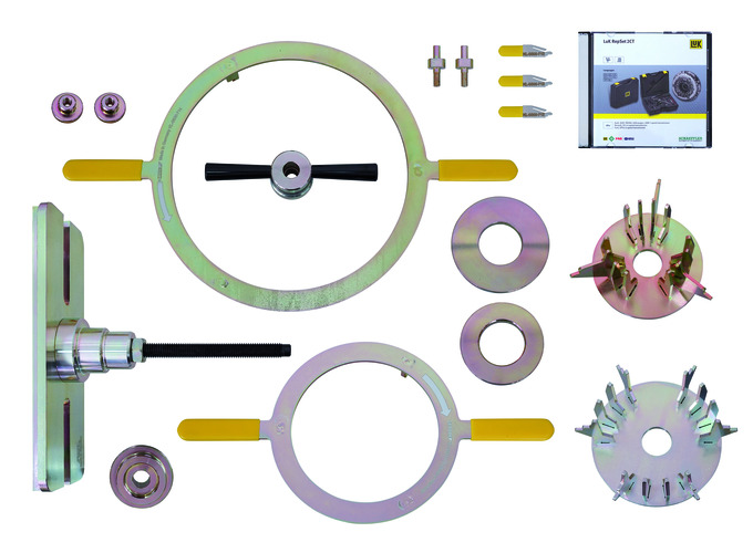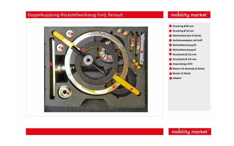 Erforderlich in Verbindung mit dem Doppelkupplungswerkzeugsatz Ford, zum fachgerechten zurückstellen der Transportsicherung, wenn die Doppelkupplung nach dem Ausbau wiederverwendet werden soll, z.B. nach Instandsetzungsarbeiten am Getriebe. Hinweis: Bei Verwendung einer neuen Doppelkupplung für DC4 (Renault) bzw. DPS6 (Ford) Doppelkupplungsgetriebe, wird das Doppelkupplungs-Rückstellwerkzeug nicht benötigt, da diese grundsätzlich mit einer Transportsicherung ausgestattet sind. Passend für Renault und Ford PKW´s mit 6-Gang Doppelkupplungsgetrieben DC4 (Renault) und DPS6 (Ford).