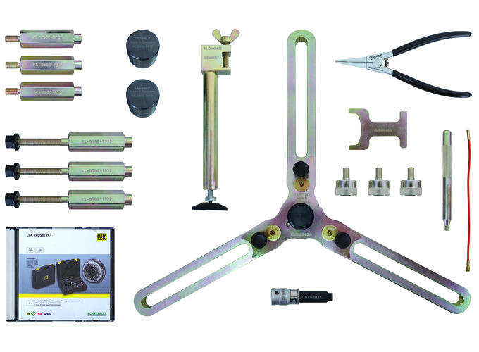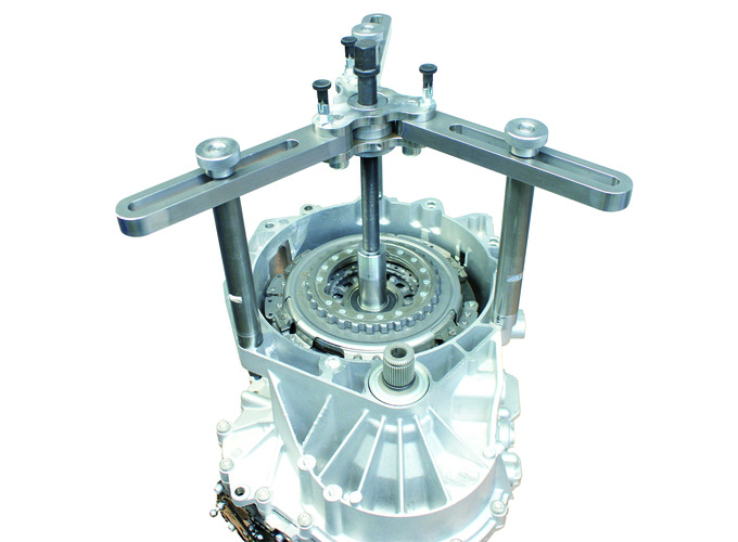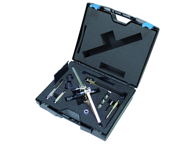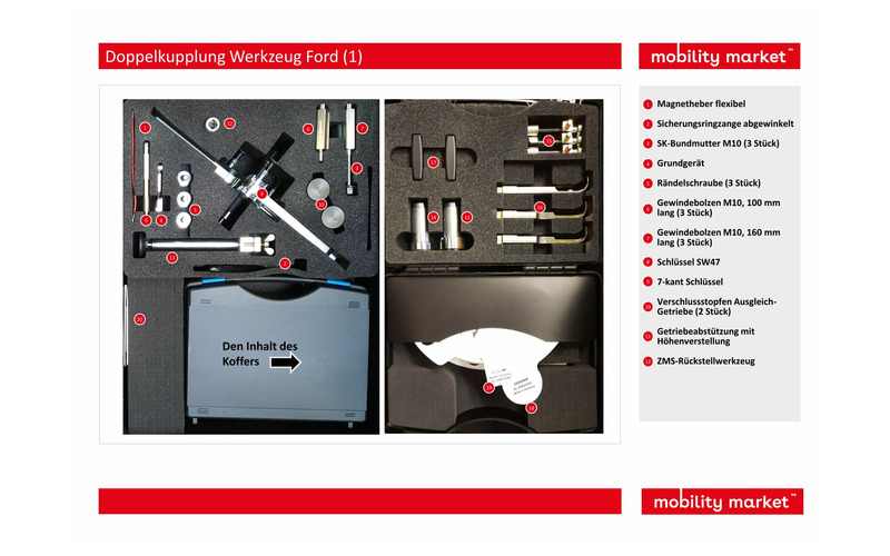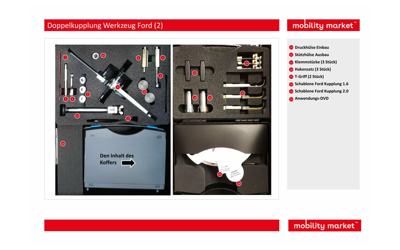 Das Doppelkupplungswerkzeug Ford ermöglicht die fachgerechte De- bzw. Montage sowie Justierung von trockenen Doppelkupplungssystemen bei Ford. Passend für Ford mit trockenen Doppelkupplungssystem, z.B. bei DPS6 Getriebe. Der Werkzeugsatz beinhaltet auch das Doppelkupplungs-Rückstellwerkzeug zur fachgerechten Zurückstellung der Transportsicherung, wenn die Doppelkupplung nach dem Ausbau wiederverwendet werden soll, z.B. nach Instandsetzungsarbeiten am Getriebe.