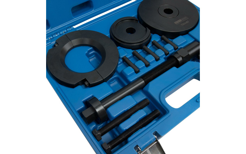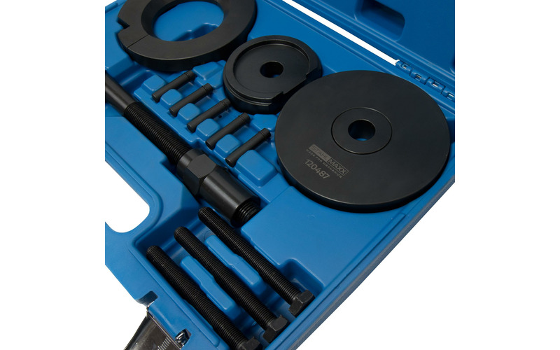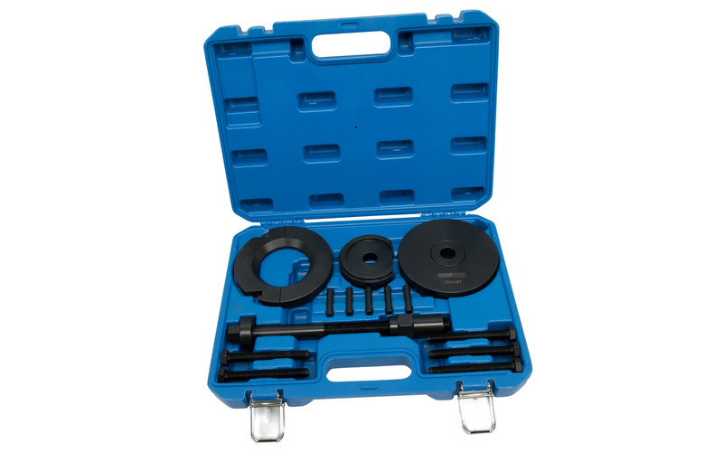 Spezialwerkzeug-Satz zum Aus- und Einpressen von Kompaktradlagern an der Hinterachse, ohne den Achsschenkel und ABS-Sensor auszubauen. Geeignet für viele Transporter/Vans von Citroen, Opel, Peugeot und Toyota.