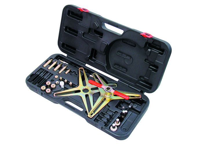Der SAC Kupplungswerkzeug-Satz ist zwingend erforderlich zum fachgerechten und beschädigungsfreien Aus- sowie Einbau von SAC-Kupplungen (Self-Adjusting-Clutch = Selbstnachstellende Kupplung) und ermöglicht zusätzlich das Rückstellen des SAC-Nachstellrings in der Kupplungs-Druckplatte. Ein beschädingungsfreier Aus- und Einbau ist ohne ein SAC Kupplungswerkzeug nahezu unmöglich, da die Kupplung dabei verspannt oder beschädigt werden kann, dies führt unweigerlich zu einer Fehlfunktion bzw. einem Defekt der Kupplung und diese muss erneuert werden. Das im Lieferumfang enthaltene Kupplungs-Zentrierwerkzeug ermöglicht eine Zentrierung von Kupplungsscheiben, mit einem Naben-Ø von 15 - 28 mm und einem Führungslager bzw. Kurbelwellen-Bohrungs-Ø von 12 - 28 mm. Auch Fahrzeuge ohne Führungslager in der Kurbelwelle stellen kein Problem dar. Die zwei Spann- / Zentrierelemente gewährleisten dabei auf dem ersten Spannelement die präzise Zentrierung in der Kupplungsscheibe und auf dem zweiten Spannelement die präzise Zentrierung im Führungslager bzw. der Kurbelwellenbohrung. Selbst Kupplungen mit größerem Kurbelwellen-Bohrungs-Ø als Kupplungs-Naben-Ø können sauber und präzise Zentriert werden. Universell passend für nahezu alle auf dem Markt erhältlichen SAC-Kupplungen mit 3- und 4-Loch Teilung. Eingebaut z.B. bei VW-Audi, BMW, Mercedes, Volvo, Opel, Renault etc.