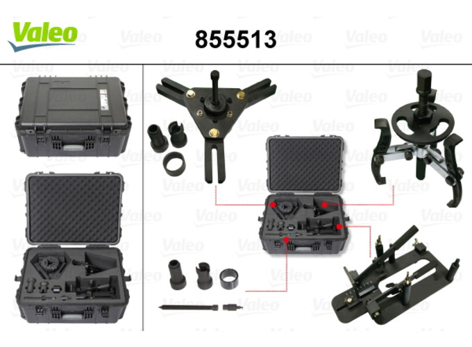 Mit diesem Werkzeugsatz von Valeo (855513) können die trockenen VALEO-Doppelkupplungen DDC der Marken Hyundai und Kia de-/montiert und eingestellt werden.