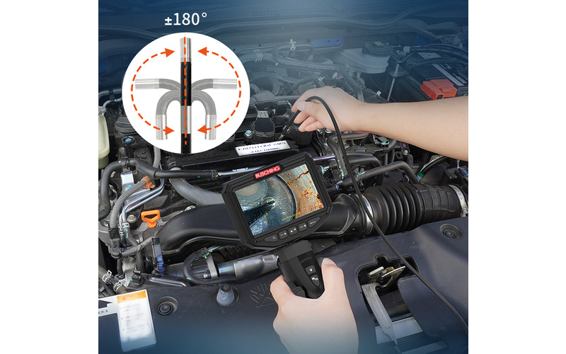 Das Endoskop ist mit einer 2-Wege-180°-Sonde ausgestattet, die einen Durchmesser von 3,9 mm aufweist. Der Schwarzweiß-Filter ermöglicht Schäden wie, z.B. Haarrisse sichtbarer zu machen. Ein abnehmbarer 5" IPS-Monitor mit einer Auflösung von 1280 x 720 Pixel ermöglicht die visuelle Betrachtung. Die Kamerasonde ist IP67-zertifiziert und beinhaltet eine 1/9" CMOS-Kamera für hochauflösende Bilder. Die Spannungsversorgung erfolgt über einen Li-Ion 3.7V 5000mAh Akku. Der Fokusbereich des Endoskops variiert zwischen 20-50 mm und das Sichtfeld ist mit 80° abgedeckt. Die Arbeitsleuchte ist mit 6 dimmbaren Mini-LEDs ausgestattet. Zur Datenspeicherung steht eine 8GB Micro-Speicherkarte zur Verfügung. Das Endoskop unterstützt die Konfiguration in 12 verschiedenen Sprachen.