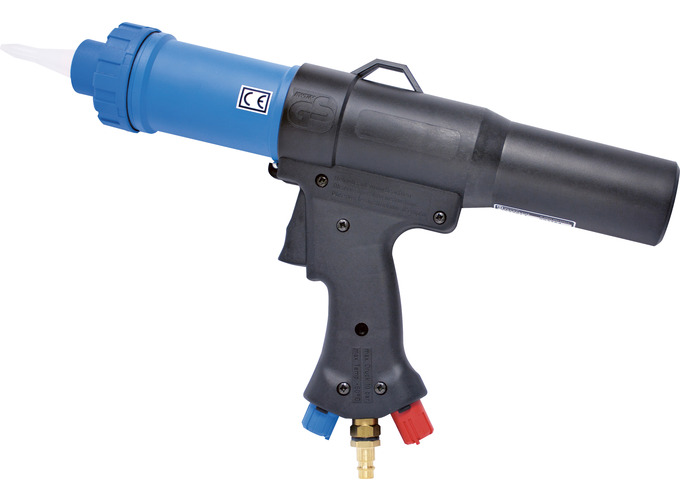 Professionelle, druckluftbetriebene Kartuschenpistole mit getrennten Regelventilen für Sprühluft und Materialschub.