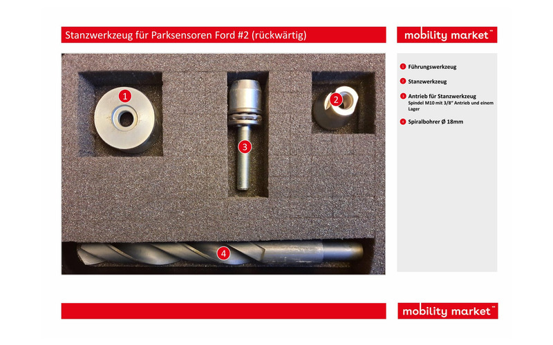Mit diesem Werkzeugsatz kann man die Löcher für die rückwertigen Parksensoren der Ford Modelle Fiesta, Focus (inkl. Turnier), C-Max und Kuga ausstanzen.