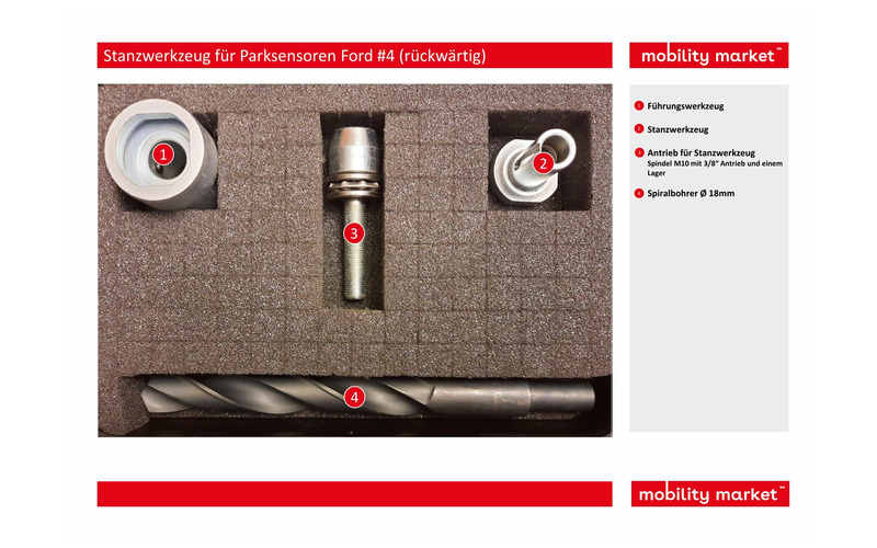Mit diesem Werkzeugsatz kann man die Löcher für die rückwertigen Parksensoren der Ford Modelle Fiesta aus-stanzen.