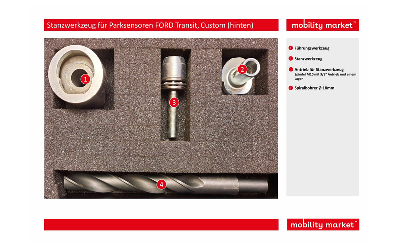 Mit diesem 4-teiligen Werkzeugsatz kann man die Löcher für die rückwertigen Parksensoren sämtlicher FORD Transit und Transit Custom Modelle ausstanzen.