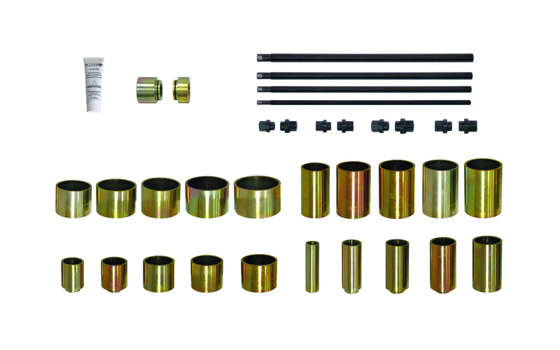 Die Zugvorrichtung ermöglicht den schnellen, sicheren und fachgerechten Aus- und Einbau von Silent- oder Gelenklagern. Der im Satz enthaltene mechanische Antrieb gewährleistet das Herausziehen von Silent- oder Gelenklagern ab einem Innenbohrungs-Ø von 10 mm. Bei sehr festsitzenden oder eingerosteten Silentlagern kann optional auch ein hydraulischer-Antrieb eingesetzt werden. Die zusätzliche Verwendung eines Pressrahmens ermöglicht auch den Aus- und Einbau z.B. von Traggelenken etc. Universell passend für Silent- oder Gelenklager mit Ø 30 - 73 mm.