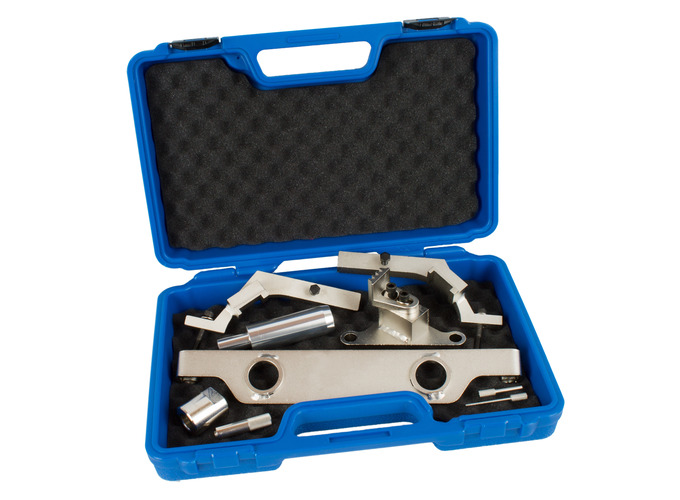 Dieser Satz umfasst alle erforderlichen Elemente, um die Komponenten von Nockenwellen, Kurbelwelle und Kettenspanner einzustellen und zu halten, während größere Arbeiten am Motor oder ein Austausch der Steuerkette und damit verbundenen Teilen vorgenommen werden.