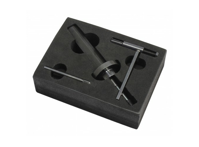 Dieses Werkzeug enthält die zusätzlichen Werkzeuge, die für die Durchführung von Servicearbeiten an der unteren Steuerkette bzw. dem Riemen im Öl, der von der Hochdruck-Kraftstoffpumpe zur Kurbelwelle verläuft, erforderlich sind. Außerdem enthält es die Einstell- und Arretierwerkzeuge für die Kraftstoffpumpe und das Ausrichtungswerkzeug für den unteren Steuergehäuse-deckel, sowie den Wellendichtring-Einzieher.