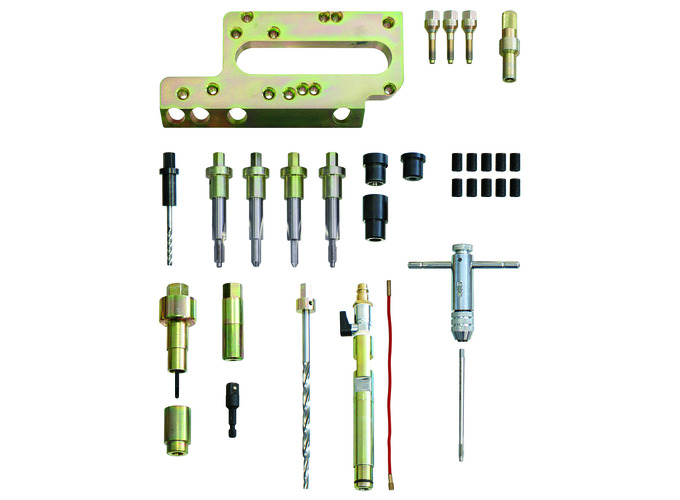 Der Glühkerzen-Werkzeugsatz ermöglicht das schnelle, präzise und fachgerechte Ausbohren von beschädigten bzw. abgerissenen Glühkerzen, das Nachscheiden, Reinigen oder Reparieren des Glühkerzen-Aufnahmegewindes und das Reinigen der Glühkerzenbohrung. Die Glühkerze bzw. der Glühkerzenkopf wird mit dem Kernlochbohrer aus- bzw. aufgebohrt. Anschließend wird das Originalgewinde mit dem Spezial-Gewindebohrer nachgeschnitten und gereinigt. Bei beschädigten Glühkerzen-Aufnahmegewinden wird dies mit dem Aufmass-Gewindebohrer auf M10x1 aufgebohrt. Die Zentrier- und Führungshülsen gewährleisten, in Verbindung mit der Grundplatte, eine exakte und präzise Zentrierung und Führung sowie eine genaue Bohrungstiefe beim Ausbohren und der Gewindereparatur. Der verbleibende Glühkerzenkörper wird mit dem Auszieher herausgezogen. Die Glühkerzenbohrung, der Dichtsitz und der Glühstiftkanal wird anschließend mit dem Reinigungswerkzeug gereinigt. Passend für Mercedes CDI Dieselmotoren OM640 und OM642 mit Glühkerzengewinde M8x1.