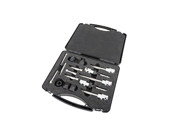 Mit diesem Werkzeugsatz können alle gängigen OAD-Freilaufriemenscheiben (Overrunning Alternator Pulley) und OAP-Generatorenentkoppler (Overrunning Alternator Decoupler) aus- und eingebaut werden.