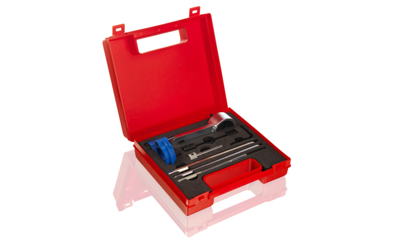 Werkzeugsatz um die Nockenwelle und die Kurbelwelle bzw. Nebenaggregate, die vom Zahnriemen angetrieben werden beim Wechseln des Zahnriemens richtig zu positionieren - inklusive der Montagehilfe für Frontmaske. Dies wird benötigt, um die Front während des Austausches des Antriebsriemens in die Serviceposition zu bringen.