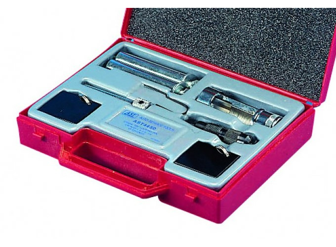 Werkzeugsatz mit dem die Nockenwelle und die Kurbelwelle bzw. Nebenaggregate, die vom Zahnriemen angetrieben werden beim Wechseln des Zahnriemens richtig positioniert werden können. Inklusive Montagehilfe für die Frontmaske, sie wird benötigt, um das vordere Ende während des Austausches des Antriebsriemens in die Serviceposition zu bringen.